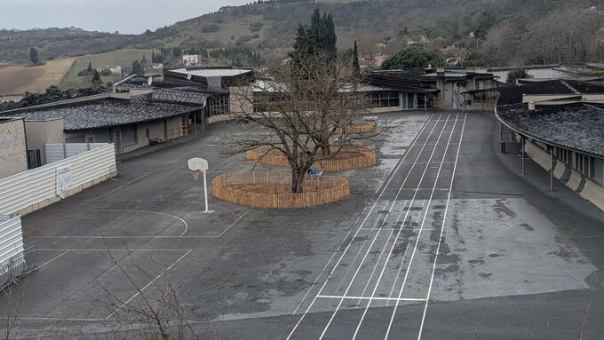 En effet, sous l'impulsion du conseil départemental la cour des Portanelles a bénéficié d'une première partie de travaux pendant les vacances. L'entreprise Solution Paysage 81, dirigée par Vincent Assié, a profité de l'absence des élèves pour enlever du bitume autour des trois arbres existants, pour créer de larges zones désimperméabilisées, y apportant de la terre végétale pour y implanter des massifs.